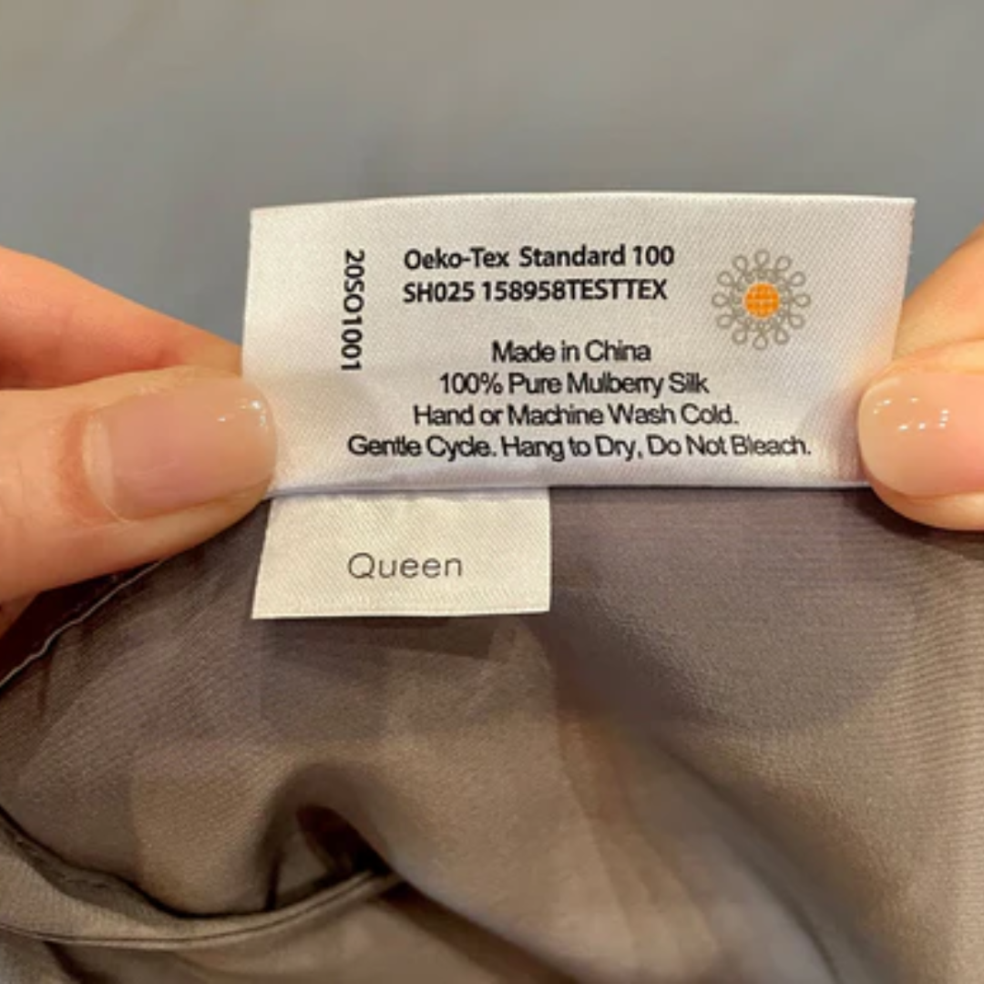 Esta etiqueta confirma que a seda utilizada passou pelos testes da certificação OEKO-TEX®, garantindo um material seguro, livre de substâncias nocivas e adequado para o contato direto com a pele.