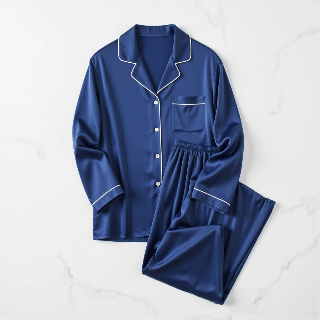 Nosso pijama é confeccionado com seda de amoreira de alta qualidade e um toque de elastano, garantindo um tecido com caimento impecável, toque sedoso e leve elasticidade para maior conforto.